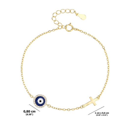 Pulsera de Plata de ley 925 - Bañada en Oro con Cruz y Ojo Turco – Diseño Minimalista con Circonitas – Ajustable 16 + 3 cm